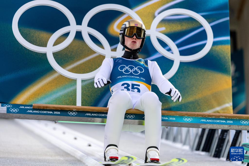 2月17日,挪威选手奥夫特布罗在个人大跳台比赛轮中。