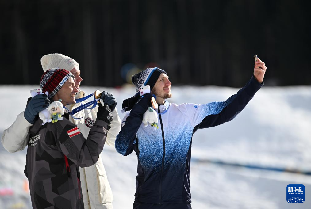 2月17日,冠军挪威选手奥夫特布罗(中)、亚军奥地利选手兰帕特尔(左)和季军芬兰选手海罗拉在颁奖仪式上自拍。