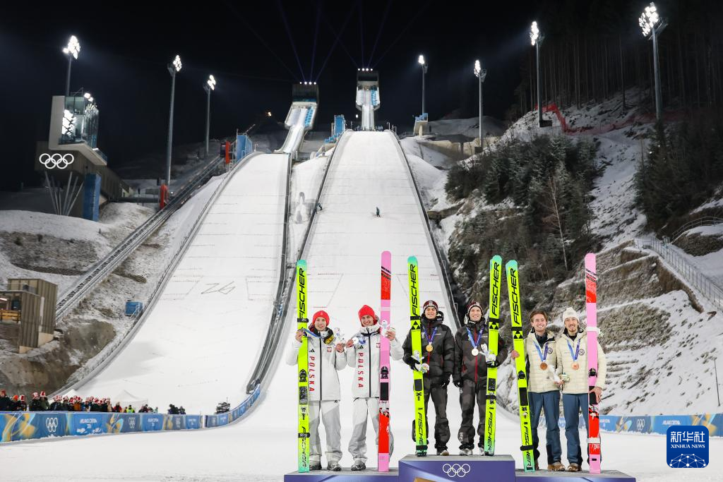 2月16日,冠军奥地利队(中)、亚军波兰队(左)、季军挪威队在颁奖仪式上。