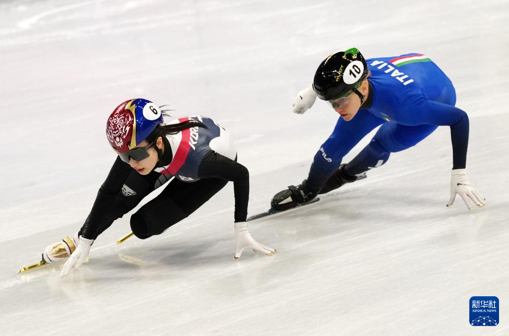 2月18日,韩国队选手金吉莉(左)在比赛中率先冲线后庆祝。
