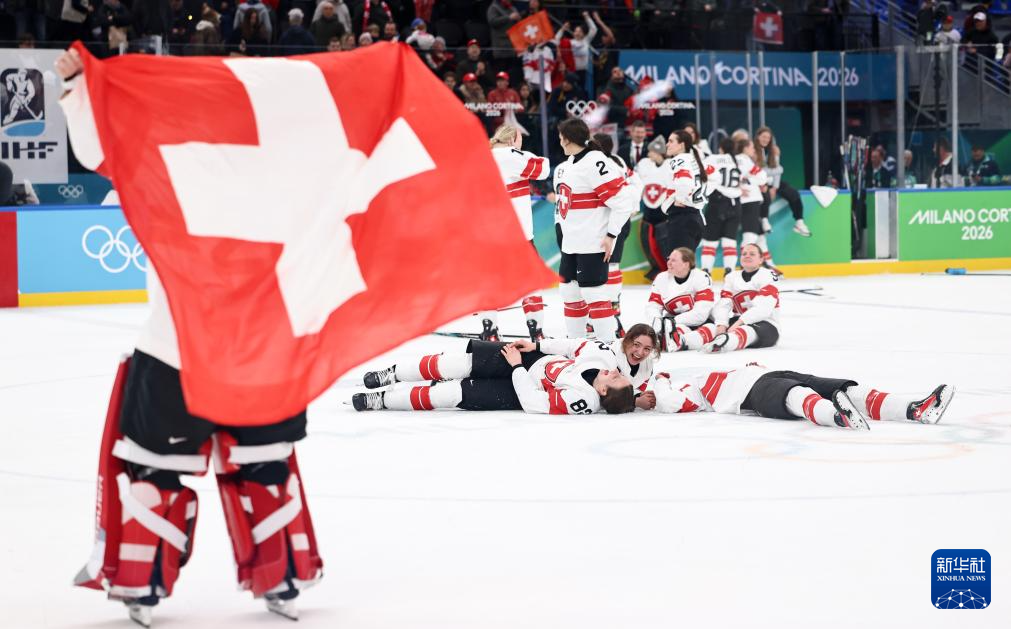 2月19日,瑞士队球员拉拉·斯塔尔德在赛后躺在冰面上庆祝胜利。