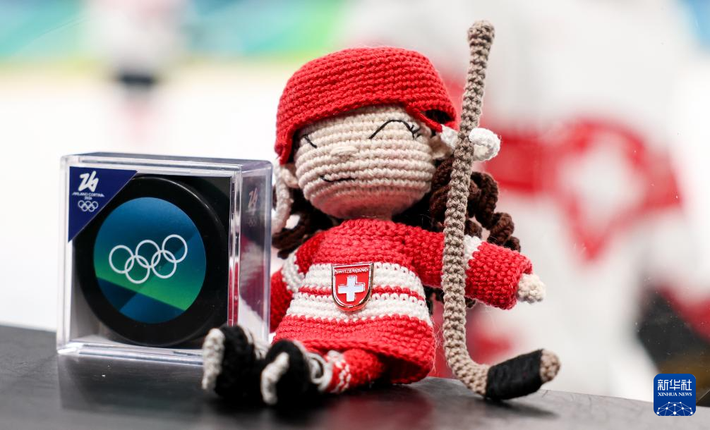 这是2月19日赛前拍摄的瑞士队主题玩偶和纪念冰球。