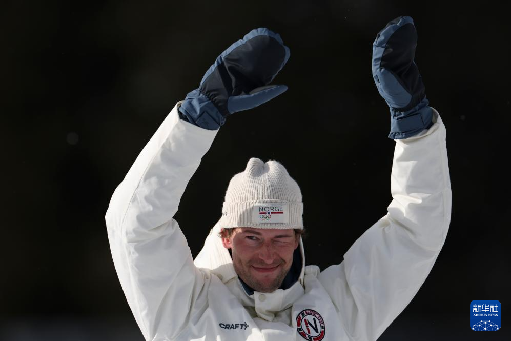 2月20日,亚军挪威选手斯图拉·霍尔姆·莱格雷德在颁奖仪式上庆祝。