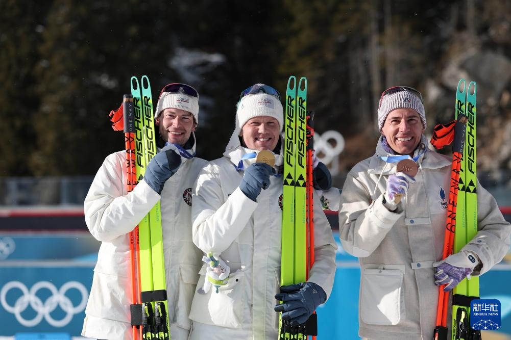 2月20日,亚军挪威选手斯图拉·霍尔姆·莱格雷德、冠军挪威选手约翰内斯·戴尔、季军法国选手康坦·菲永·马耶(从左至右)在颁奖仪式上合影。