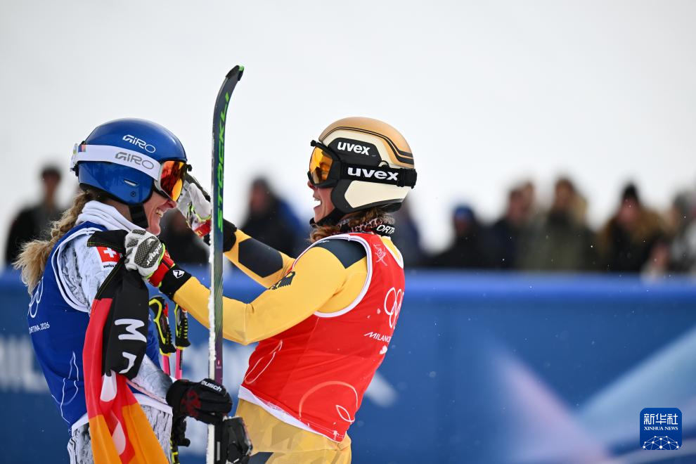 2月20日,获得冠军的德国选手达妮埃拉·迈尔(右)在决赛结束后与获得亚军的瑞士选手范妮·史密斯相互拥抱。