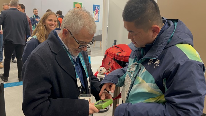 ↑刘宸赫在利维尼奥奥运村的工作岗位上