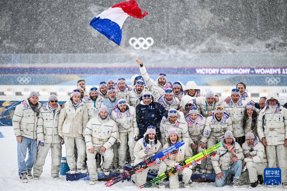2月21日,法国队成员在颁奖仪式上合影。