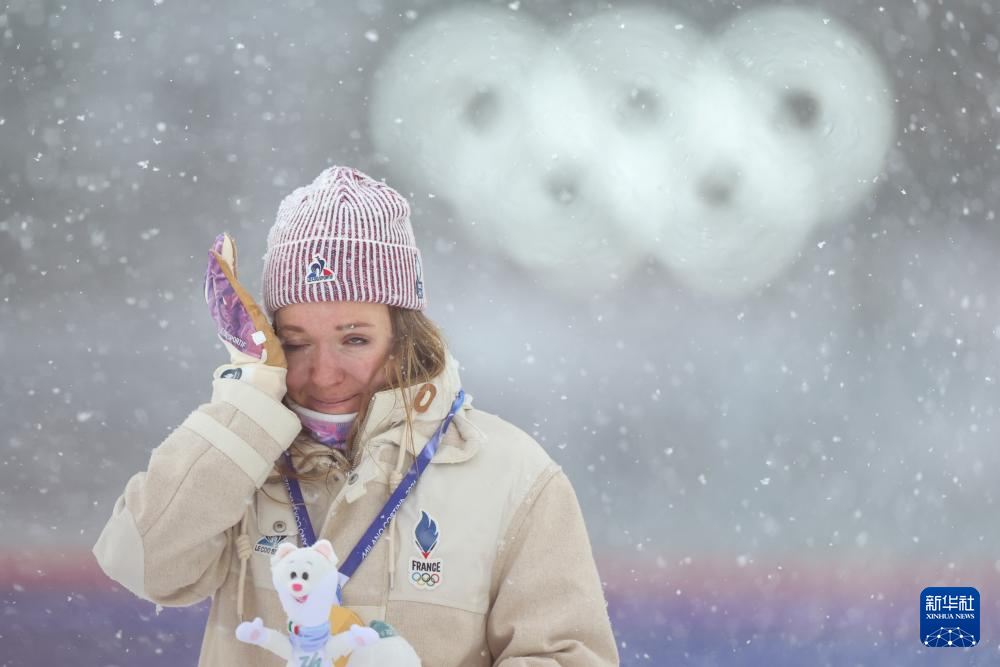 2月21日,冠军法国选手米舍隆在颁奖仪式上流泪。