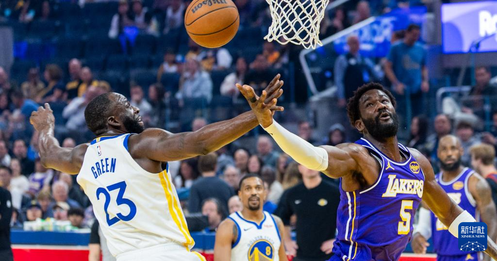4月9日,勇士队球员格林(左)与湖人队球员德安德烈·艾顿在比赛中争抢。