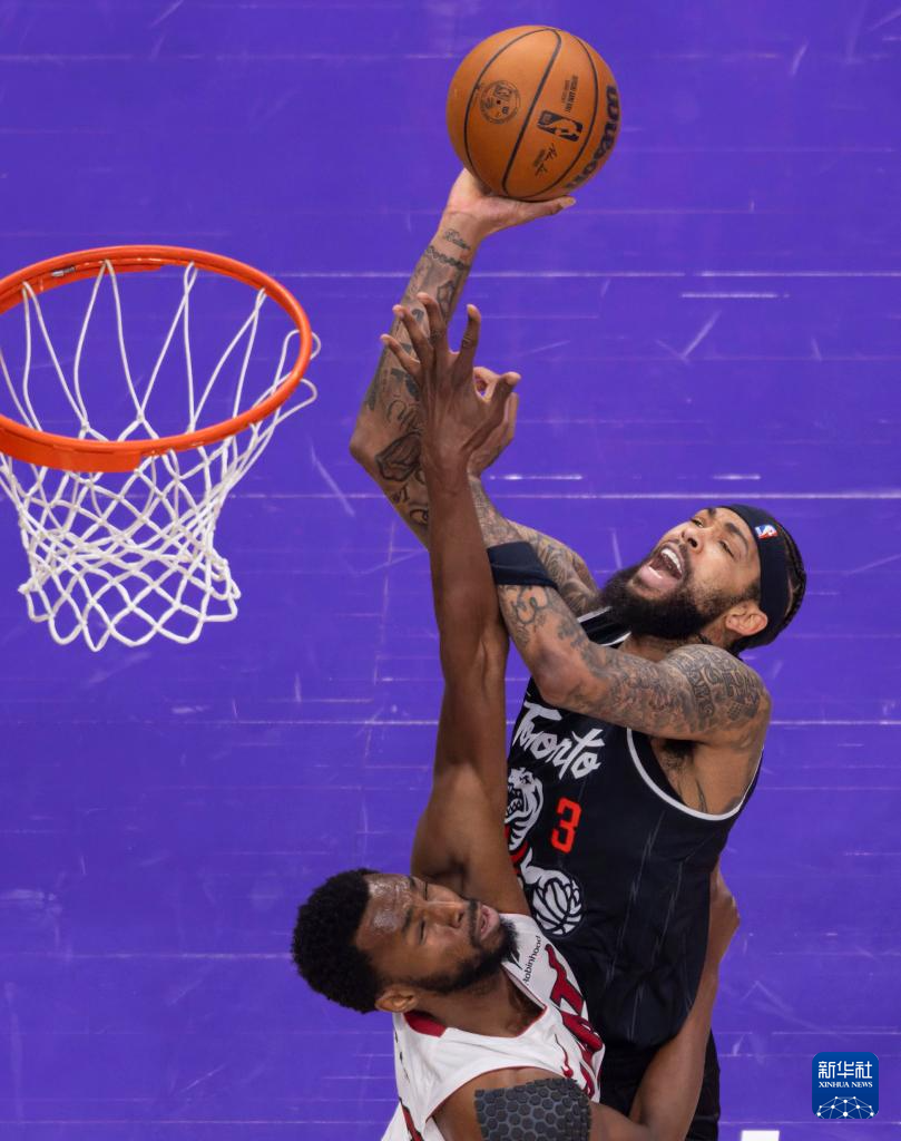 4月9日,猛龙队球员巴恩斯(中)在比赛中上篮。