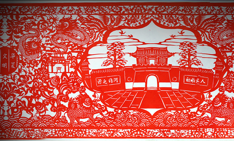 于是我決定回家專門剪紙,但是我父母認(rèn)為鉸花都是老婆婆們閑著沒事做的事,你一個男孩子還是應(yīng)該好好賺錢。就這樣我跟父母僵持了很久,但最后還是我拗著性子從外邊回到了我們農(nóng)村老家,開始尋找會剪紙的老人,去記錄、去詢問、學(xué)習(xí)我們地區(qū)傳統(tǒng)的剪紙民俗知識。因?yàn)楝F(xiàn)在像剪紙這個藝術(shù),在我們的地區(qū)還僅是一些老人出自一些喜好去剪、去做,但隨著這些老人的去世,這些作品也就會隨著一把火被燒掉。我希望我能把這些東西都保留下來,我希望有更多的人去了解我們地區(qū)的剪紙文化,所以我就下決心收集這些剪紙的資料,去申報(bào)非物質(zhì)文化遺產(chǎn)名錄。想要申報(bào)還要去做很多的事情,一是去尋找這些傳世的老作品,另外就是要擴(kuò)大孟津剪紙的影響力,參加各種比賽去獲獎。那時我白天去尋找老藝人,晚上就自己在屋里埋頭創(chuàng)作,每天晚上都會剪到凌晨一點(diǎn)多。我媽本來是反對的,但是當(dāng)她看到每晚我都會剪到很晚,她就明白了我是真心喜歡這個事兒,就慢慢地開始心疼我。后來她也幫助我開始粘貼,像我剪的《都說我孟津好風(fēng)光》,這個作品長13米,沒有那么長的紙,我們就一起粘貼?;巳齻€多月剪完,家里邊沒有那么大粘貼裝裱的空間,我父母就站在我們家院子的平房頂上一起把它鋪開,一個一個地粘起來裱好。
