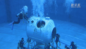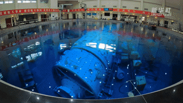 這里是航天員模擬失重水槽訓(xùn)練場。當(dāng)飛船繞地心運(yùn)動時,會產(chǎn)生失重。航天員要在失重狀態(tài)下進(jìn)行空間出艙活動和裝配維修等任務(wù)。實(shí)踐證明,模擬失重水槽訓(xùn)練是在地面上進(jìn)行航天員艙外活動訓(xùn)練的最為有效方法。