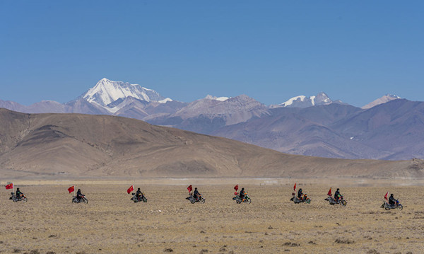 夜幕降臨高原,一天的訓(xùn)練結(jié)束。隊(duì)員們騎著車從鄉(xiāng)里散去,出發(fā)前不忘再緊一緊車尾的國(guó)旗。一輪明月懸在喜馬拉雅山脈的群山上,照亮了守邊人的回家路。