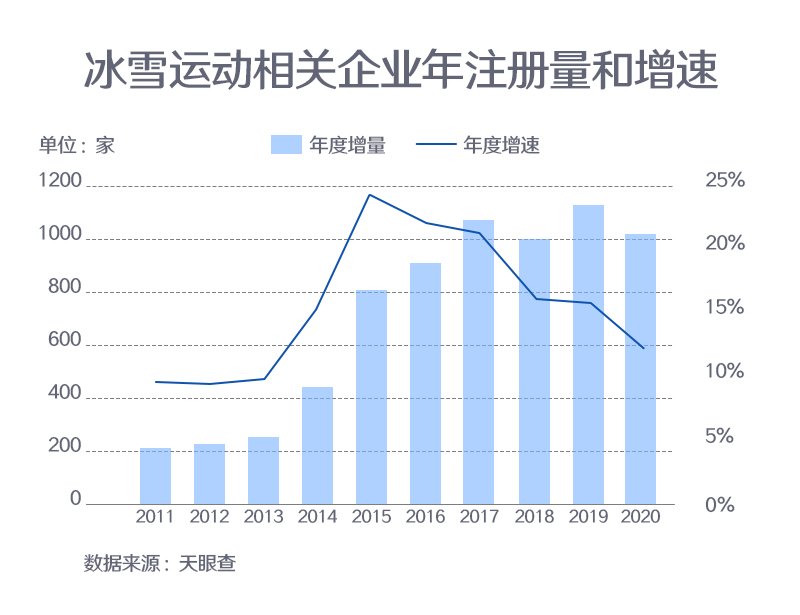 ??? 資料顯示,2015年7月31日,北京獲得2022年冬奧會(huì)舉辦權(quán)。同年,天眼查專業(yè)版數(shù)據(jù)顯示,冰雪運(yùn)動(dòng)相關(guān)企業(yè)年度注冊(cè)增速達(dá)到了歷史峰值(全部企業(yè)狀態(tài)),為24.4%。此后的幾年,冰雪運(yùn)動(dòng)相關(guān)企業(yè)總量仍呈上漲態(tài)勢(shì)。以工商登記為準(zhǔn),2020年我國(guó)共新增超過1,000家冰雪運(yùn)動(dòng)相關(guān)企業(yè)。