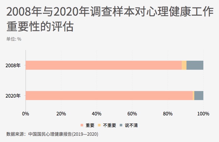 ??? 心理健康意識體現(xiàn)為認(rèn)識到心理健康工作的重要性。對于心理健康工作重要性的評估,2020年調(diào)查中,有94.0%的調(diào)查對象認(rèn)為心理健康工作是重要的。與2008年相比,2020年調(diào)查中,有更多的人認(rèn)為心理健康工作重要,比12年前提高了6.1個百分點(diǎn),說明人們的心理健康意識有所增強(qiáng)。