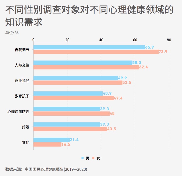 ??? 2020年調(diào)查詢問人們需要哪些方面的心理健康知識,并分析不同群體的需求特征。數(shù)據(jù)顯示,“自我調(diào)節(jié)”、“人際交往”、“職業(yè)指導(dǎo)”位列選擇的前三。另外,女性在各項(xiàng)心理健康知識的需求上的選中率均高于男性,提示著女性對心理健康知識有更主動和迫切的需求。