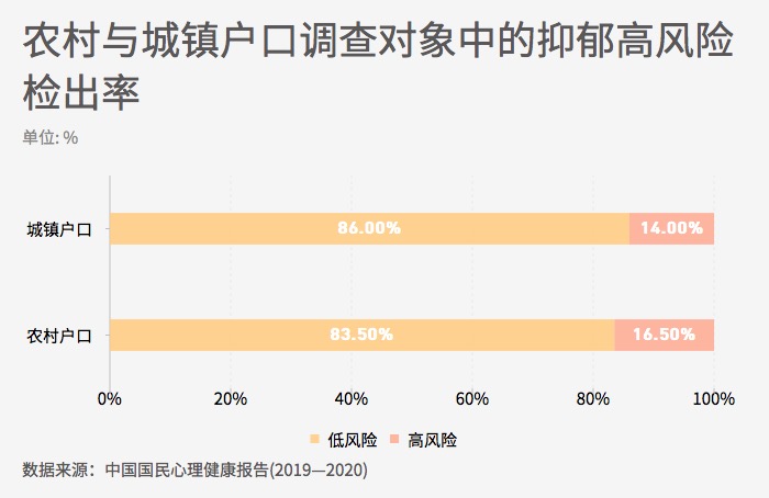 ??? 國內(nèi)外研究普遍發(fā)現(xiàn),社會經(jīng)濟(jì)地位通常與心理健康水平呈正相關(guān)。較高的收入水平、較高的學(xué)歷、聲望較好的職業(yè),往往意味著擁有包括心理健康資源在內(nèi)的各種資源支持,有助于維護(hù)更高的心理健康水平。研究也發(fā)現(xiàn),農(nóng)村戶口人群與城鎮(zhèn)戶口人群之間存在心理健康水平差異。調(diào)查中發(fā)現(xiàn)農(nóng)村戶口人群中抑郁高風(fēng)險(xiǎn)的檢出率略高于城鎮(zhèn)戶口人群。