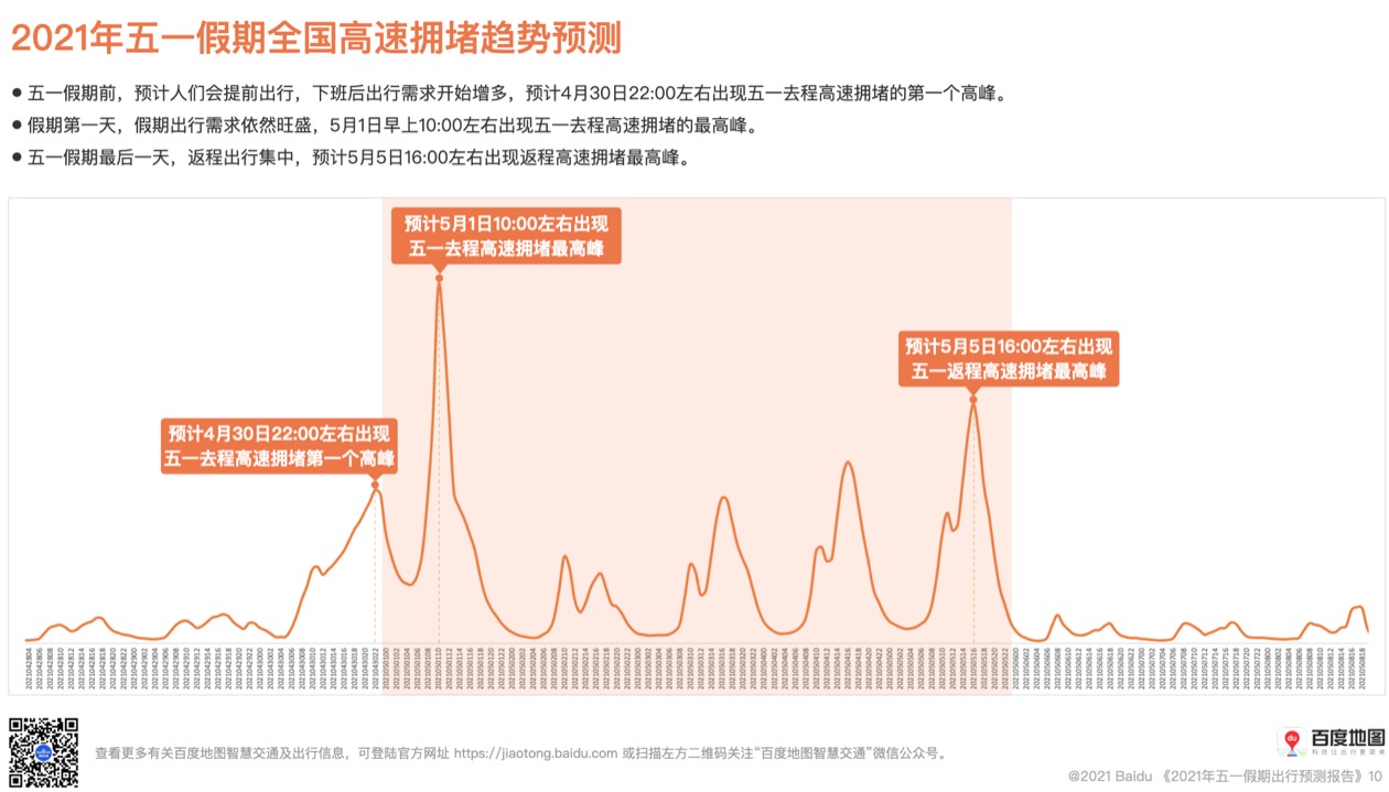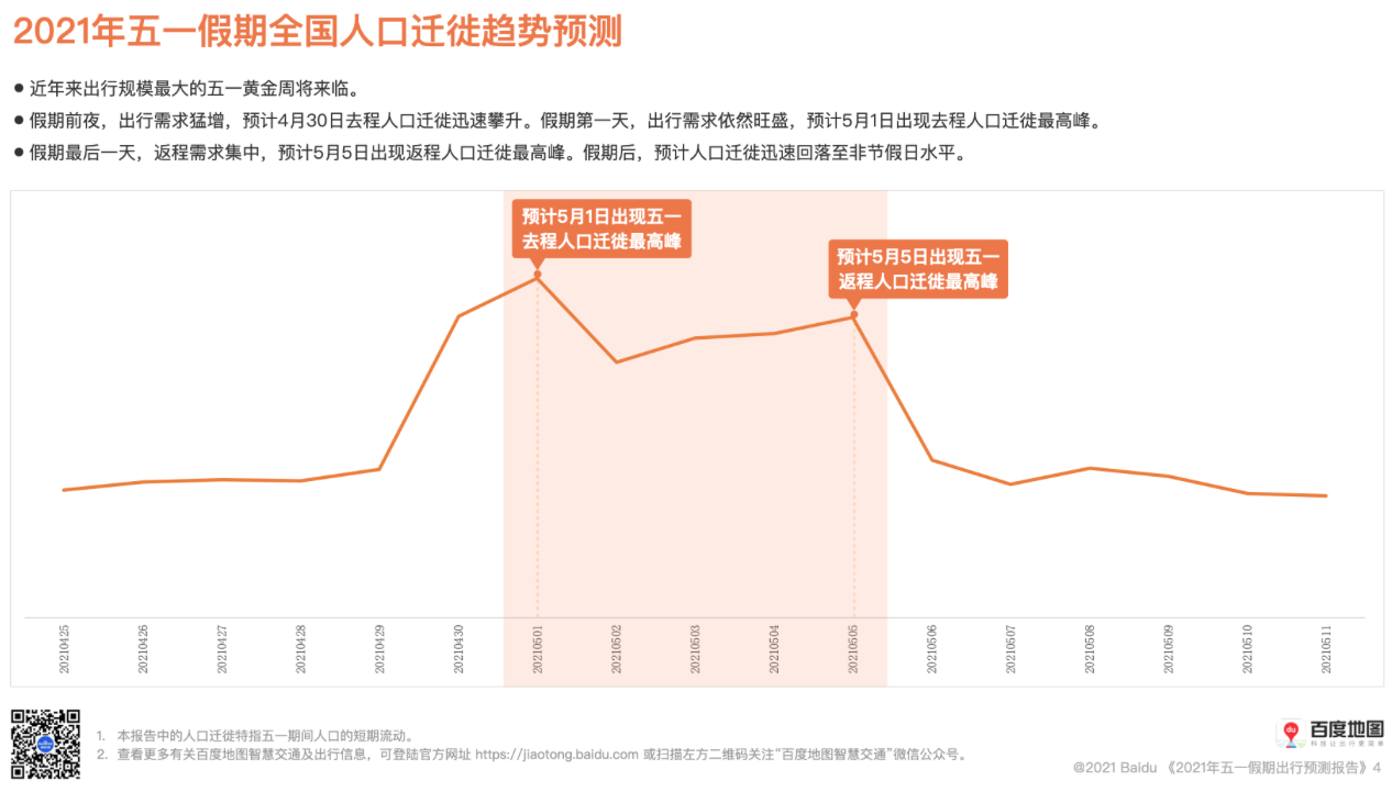 ????? 今年“五一”假期繼續(xù)延續(xù)“加長版”,5天長假點燃了眾多消費者的出游熱情。根據(jù)中國旅游研究院的預(yù)測,今年“五一”國內(nèi)旅游出游有望達(dá)到2.2億人次,按可比口徑甚至超過疫前同期水平。根據(jù)百度地圖《2021年五一假期出行預(yù)測報告》,近年來出行規(guī)模最大的“五一”黃金周將來臨。預(yù)計5月1日出現(xiàn)五一去程人口遷徙最高峰。