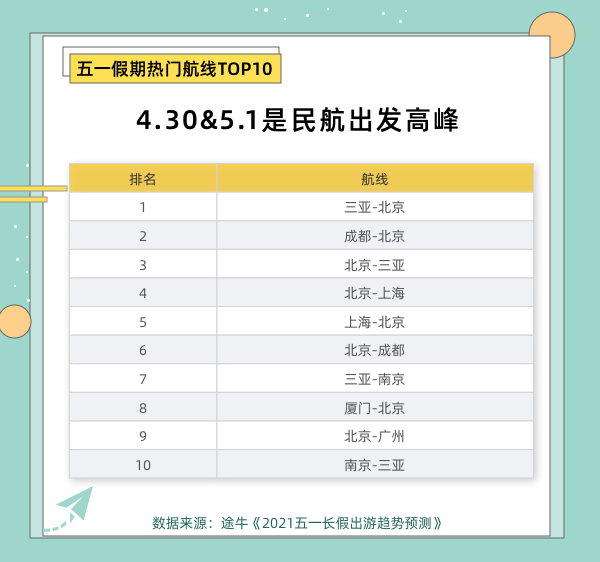 ????? 根據(jù)途牛發(fā)布的《2021五一長假出游趨勢預(yù)測》數(shù)據(jù),在旅游快速復(fù)蘇、“加長版”假期、旅游優(yōu)惠活動等多重利好下,今年“五一”計劃出游的人數(shù)將暴增。出行人數(shù)的激增使多條熱門航線票價大漲,4月30日和5月1日兩天是民航出發(fā)最高峰,而返程高峰將出現(xiàn)在5月4日、5日的假期末尾。