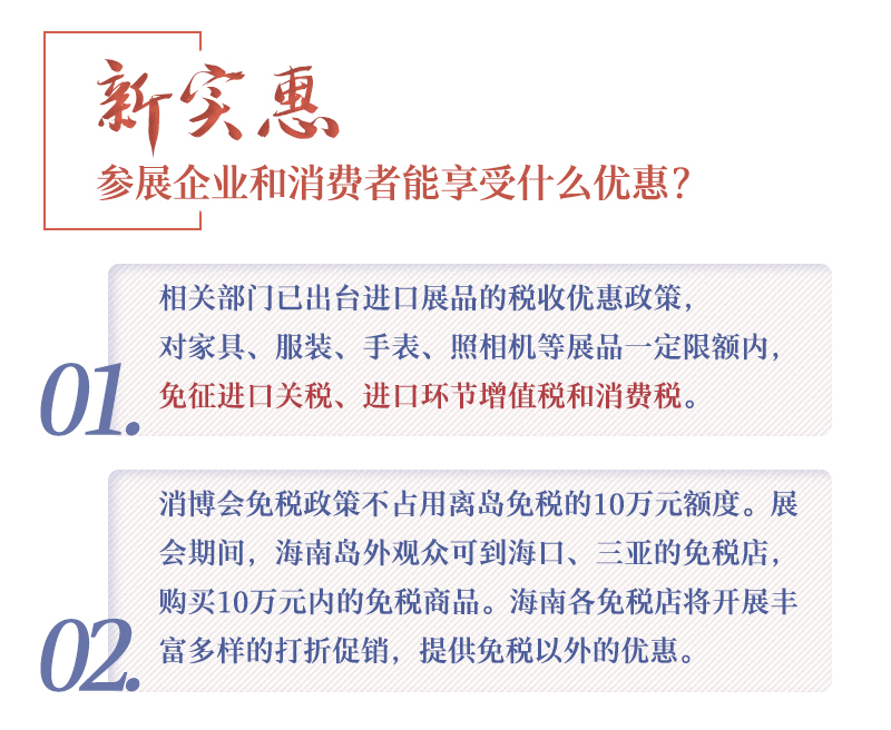 ??? 除了空前的展覽規(guī)模,本屆消博會還為參展企業(yè)和消費者提供稅收優(yōu)惠政策:家具、服裝、手表、照相機等展品一定限額內(nèi),免征進口關稅、進口環(huán)節(jié)增值稅和消費稅,并且消博會提供的免稅政策不占用離島免稅的10萬元額度。