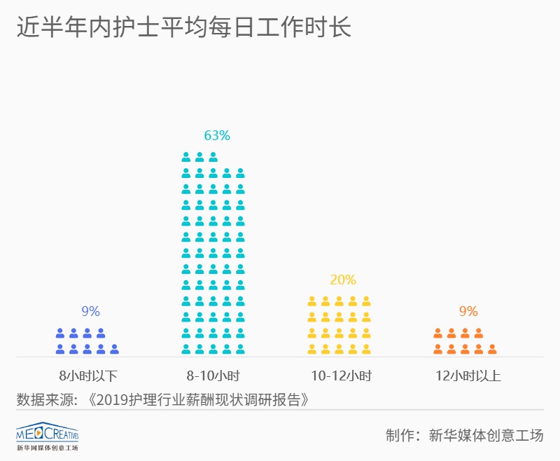 2019年8月,醫(yī)學界傳媒發(fā)布《2019護理行業(yè)薪酬現(xiàn)狀調研報告》,報告顯示91%的護士每日工作8小時以上,近三成護士每日工作超過10小時,其中超過12小時占比9%,大部分護士每日工作時間在8—10小時。