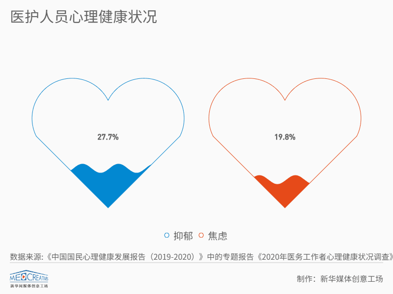 根據(jù)最新出版的心理健康藍皮書《中國國民心理健康發(fā)展報告(2019~2020)》中,對醫(yī)務人員進行了一期專題報告《2020年醫(yī)務工作者心理健康狀況調查》的數(shù)據(jù)顯示,27.7%的醫(yī)護工作者可能存在抑郁傾向,19.8%的醫(yī)護工作者有焦慮傾向。護士群體的焦慮水平僅次之醫(yī)生,護士抑郁高風險比例為9%,30—45歲醫(yī)務工作者抑郁水平最高。