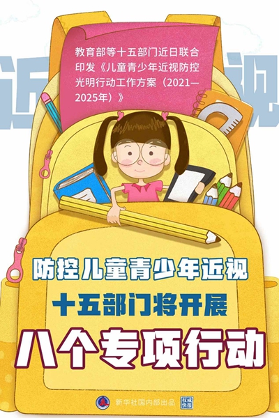 ????? 教育部等十五部門近日聯合印發(fā)《兒童青少年近視防控光明行動工作方案(2021—2025年)》,共同實施八個專項行動防控兒童青少年近視。工作方案提出,力爭到2025年每年持續(xù)降低兒童青少年近視率,有效提升兒童青少年視力健康水平。