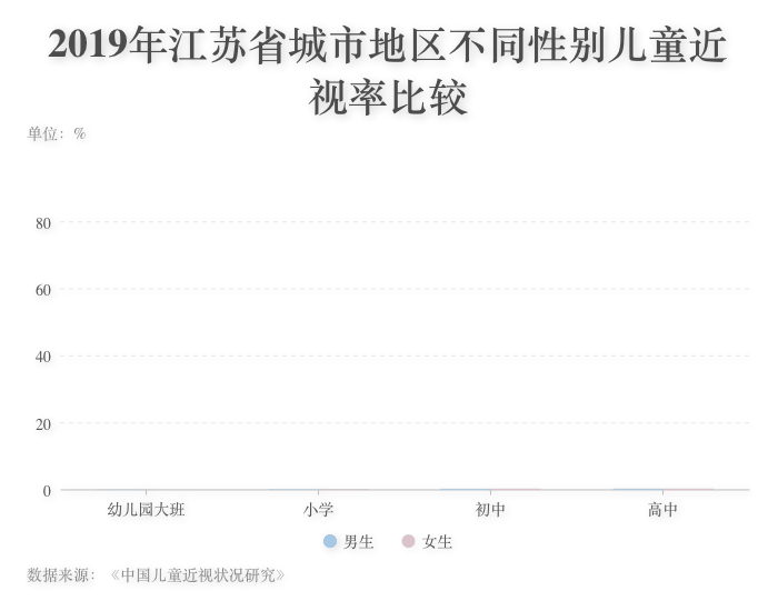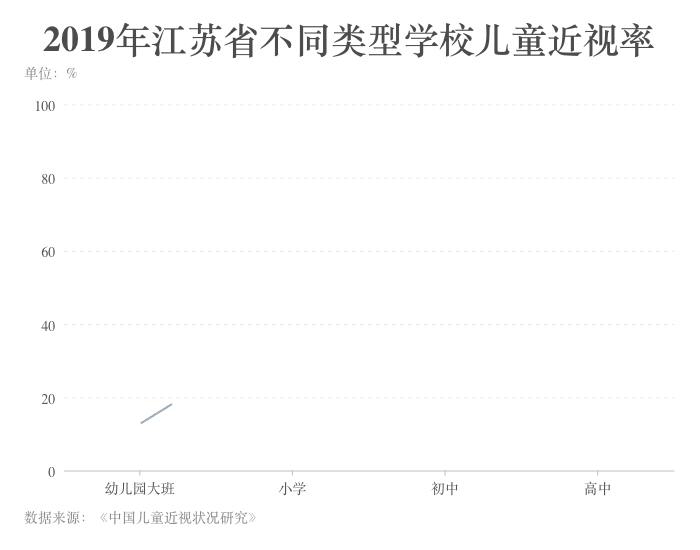 ????? 中國兒童近視率隨年齡的增長呈現上升趨勢。以江蘇省2019年的調查結果為例,該省幼兒園大班兒童近視率為12.8%,小學階段增長至38.5%,初中階段增長至80.2%,顯示出近視率在小學和初中階段增長速度較快,說明低年齡階段是近視防控的重點階段。