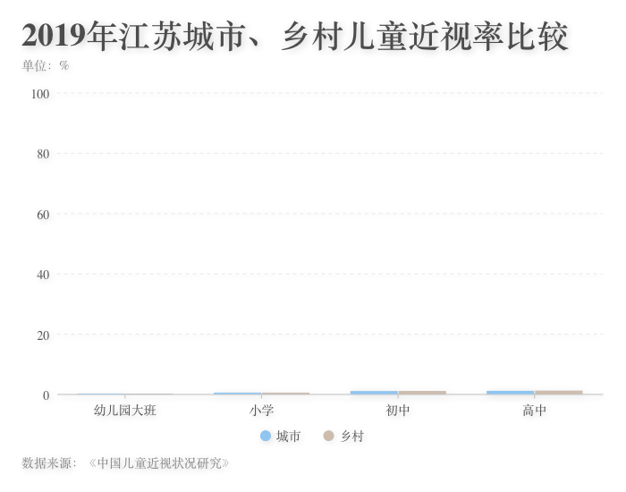 ????? 調查顯示,中國城市地區(qū)的兒童總體近視率約為48.8%,顯著高于鄉(xiāng)村地區(qū)兒童的近視率(31.9%)。但是在不同階段尤其在中學階段,有調查結果顯示鄉(xiāng)村兒童近視率反超城市兒童。以江蘇省為例,該地區(qū)幼兒園大班和小學階段城市兒童近視率高于鄉(xiāng)村兒童,初中和高中階段城市兒童近視率低于鄉(xiāng)村兒童,顯示出鄉(xiāng)村兒童在小學至初中階段近視增長率高于城市兒童,需要重點防控。
