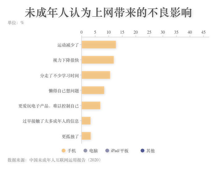 ????? 近年來,青少年使用電子產品機會和上網時間的增多,也直接導致了許多兒童身體素質下降和視力損害。調查顯示,未成年人認為不同終端上網帶來的不良消息影響中,“視力下降很快”和“運動減少”這兩項占的比例最高。