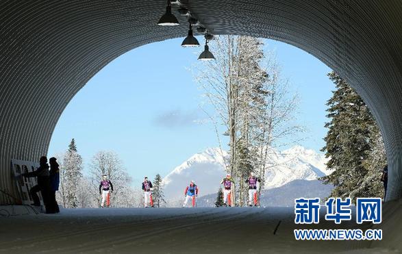 ????資料圖片:2月5日,運動員在訓練時穿過賽場的一處隧道。當日,各隊運動員來到索契雪上賽區(qū)勞拉越野滑雪和冬季兩項中心進行適應性訓練,以備戰(zhàn)8日在這里開始的冬奧會越野滑雪比賽。 新華社記者 王松 攝
