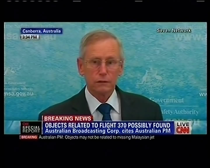 ??? 澳方稱(chēng)在印度洋中發(fā)現(xiàn)了可能與馬航失聯(lián)客機(jī)有關(guān)物體這張3月20日拍攝的CNN視頻截圖顯示,澳大利亞海事安全局官員在堪培拉召開(kāi)的新聞發(fā)布會(huì)上發(fā)言(左圖為相關(guān)搜尋海域的示意圖)。澳大利亞總理阿博特當(dāng)日在議會(huì)說(shuō),澳方在印度洋中發(fā)現(xiàn)了可能與馬航失聯(lián)客機(jī)有關(guān)的兩個(gè)物體。澳大利亞海事安全局官員當(dāng)日說(shuō),發(fā)現(xiàn)可疑碎片的位置與之前確定的馬航失聯(lián)客機(jī)南部搜尋航道高度吻合,但當(dāng)?shù)睾S蛩沫h(huán)境非常差。新華社發(fā)