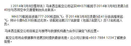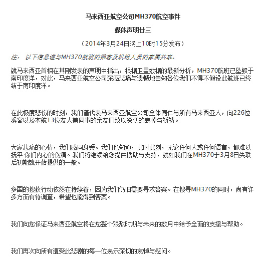 ????這份聲明標(biāo)記的時間為3月24日晚上10時15分。而在3月8日,馬航發(fā)表的聲明則表示“該航班運載227名旅客(包括2名嬰兒)及12名機組人員。”