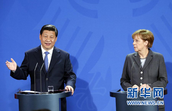 3月28日,國(guó)家主席習(xí)近平在柏林與德國(guó)總理默克爾共同會(huì)見(jiàn)記者。 新華社記者 鞠鵬 攝