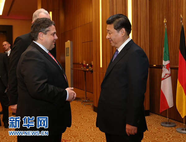 ??? 3月29日,國(guó)家主席習(xí)近平在杜塞爾多夫會(huì)見(jiàn)德國(guó)副總理兼經(jīng)濟(jì)和能源部長(zhǎng)、德國(guó)社會(huì)民主黨主席加布里爾。 新華社記者劉衛(wèi)兵攝