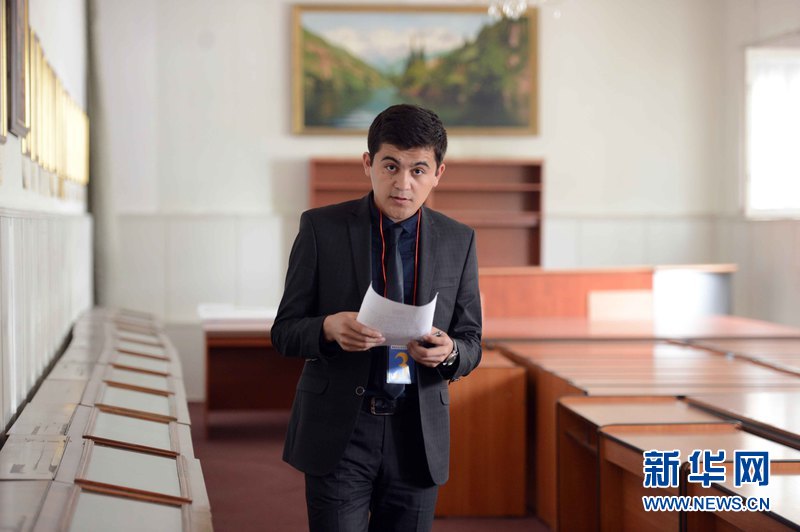 4月25日,烏茲別克斯坦塔什干國立東方學院大禮堂,世界經(jīng)濟與外交大學穆哈爾丁正在準備參加比賽。