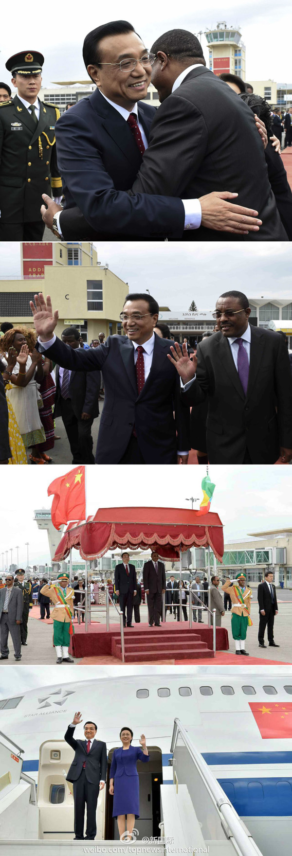 新華網(wǎng)北京5月7日電? 據(jù)新華社“新國際”微博報道,?當(dāng)?shù)貢r間6日下午,李克強總理結(jié)束對埃塞俄比亞和非盟總部的訪問,乘專機離開亞的斯亞貝巴飛赴此訪非洲的第二站尼日利亞。埃塞總理海爾馬里亞姆和夫人到機場歡送,并舉行了歡送儀式。身著民族服裝的當(dāng)?shù)孛癖娸d歌載舞歡送中國貴賓。