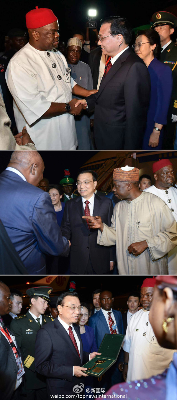 新華網(wǎng)北京5月7日電? 據(jù)新華社“新國際”微博報道,國務(wù)院總理李克強(qiáng)6日晚抵達(dá)阿布賈,開始對尼日利亞進(jìn)行正式訪問并出席第24屆世界經(jīng)濟(jì)論壇非洲峰會全會。夫人程虹同機(jī)抵達(dá)。尼外交部長、勞工部長到機(jī)場迎接,聯(lián)邦首都區(qū)部長按照接待尊貴客人的傳統(tǒng)禮儀,向李克強(qiáng)贈送了阿布賈城市鑰匙,熱烈歡迎中國總理到訪。