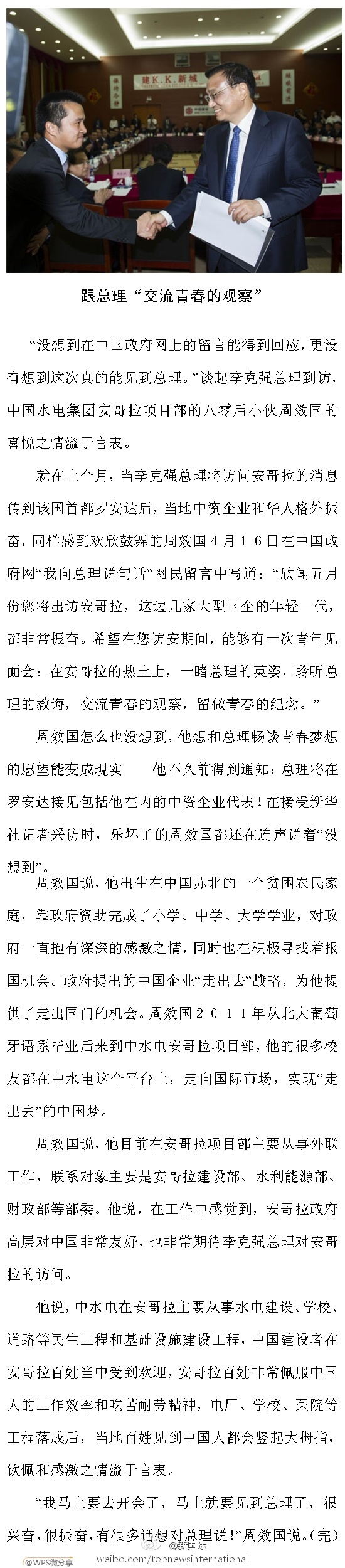 ??? 新華網(wǎng)北京5月9日電 據(jù)新華社“新國(guó)際”微博報(bào)道,80后的周效國(guó)2011年大學(xué)畢業(yè)后,被派往中水電安哥拉項(xiàng)目部工作。不久前獲知李總理將訪安,他在中國(guó)政府網(wǎng)給總理留言,希望與總理“交流青春的觀察”。8日,李克強(qiáng)在安主持召開(kāi)海外民生座談會(huì),周效國(guó)夢(mèng)想成真,受邀參加并作了發(fā)言。詳情請(qǐng)戳長(zhǎng)微。