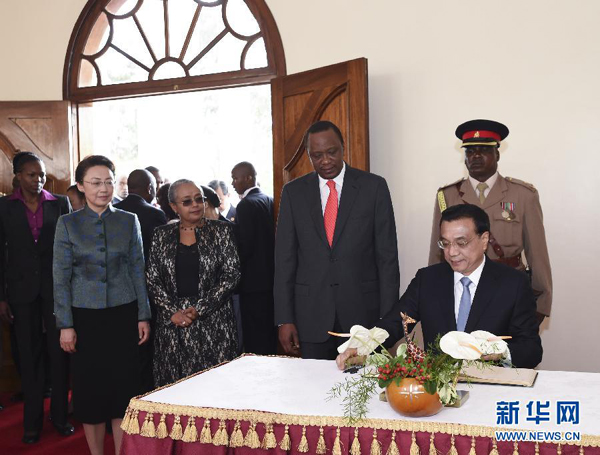 ??? 5月10日,中國國務(wù)院總理李克強在肯尼亞國家宮同肯總統(tǒng)肯雅塔舉行會談。這是會談開始前,李克強在貴賓簿上簽名。 新華社記者 李學(xué)仁 攝
