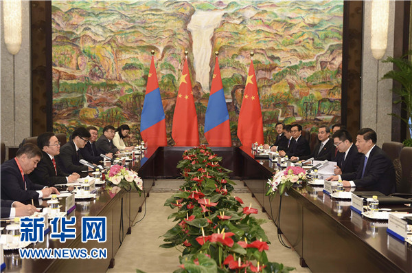 習(xí)近平強(qiáng)調(diào),我十分關(guān)心和高度重視中蒙關(guān)系。兩國領(lǐng)導(dǎo)人要保持密切交往和戰(zhàn)略溝通,實(shí)實(shí)在在推進(jìn)兩國合作。兩國立法機(jī)構(gòu)、政黨、軍隊(duì)也要加強(qiáng)交往。中蒙經(jīng)濟(jì)互補(bǔ)性強(qiáng)。中方開展對蒙合作堅(jiān)持互利雙贏原則,不搞我贏你輸、我多你少。中方愿本著礦產(chǎn)資源開發(fā)、基礎(chǔ)設(shè)施建設(shè)、金融合作“三位一體、統(tǒng)籌推進(jìn)”原則,以互聯(lián)互通建設(shè)為優(yōu)先方向,以建設(shè)絲綢之路經(jīng)濟(jì)帶為契機(jī),拓展兩國合作,鼓勵有實(shí)力的中國企業(yè)赴蒙投資興業(yè)。中方支持蒙方積極參與國際和地區(qū)事務(wù),愿同蒙方加強(qiáng)在聯(lián)合國、上海合作組織等框架內(nèi)合作。
