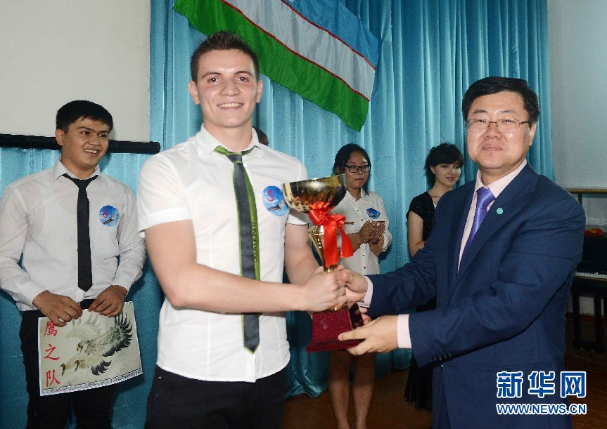 ????新華社塔什干6月9日電(記者沙達提)為慶祝中烏建交22周年,增進兩國間了解與交流,由中國駐烏茲別克斯坦使館主辦、烏茲別克斯坦世界語言大學承辦、塔什干孔子學院協(xié)辦的“長青杯”第一屆中烏知識競賽9日在烏茲別克斯坦語言大學隆重舉行。中國駐烏茲別克斯坦大使孫立杰、烏世界語言大學校長卡尤莫夫出席頒獎儀式并致辭。