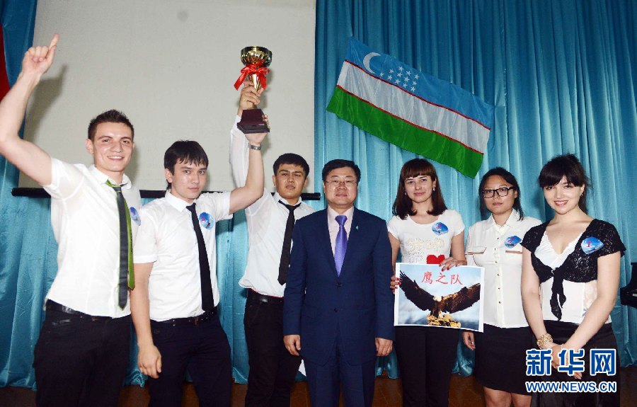 ??? 6月9日,烏茲別克斯坦首都塔什干的烏世界語言大學(xué)禮堂,中國駐烏茲別克斯坦使館孫立杰大使在向獲得冠軍的鷹之隊(duì)頒獎并合影留念。。