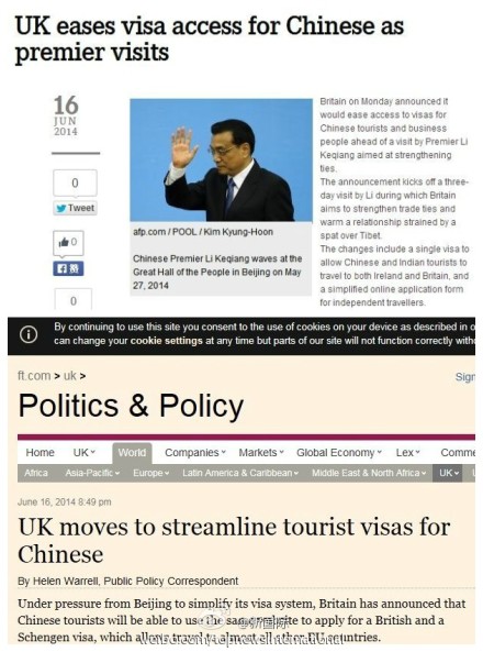 ????新華網(wǎng)北京6月17日電 據(jù)新華社“新國(guó)際”微博報(bào)道,李克強(qiáng)總理16日開(kāi)始英國(guó)之行,英方當(dāng)日宣布將放寬對(duì)中國(guó)游客和商務(wù)人士的簽證限制,簡(jiǎn)化中國(guó)個(gè)人旅行者網(wǎng)簽申請(qǐng)程序,而且英國(guó)正與其他歐洲國(guó)家談判,希望允許中國(guó)旅行者通過(guò)單一程序申請(qǐng)英國(guó)和申根國(guó)家簽證。此前,簽證難辦一直困擾赴英中國(guó)民眾。