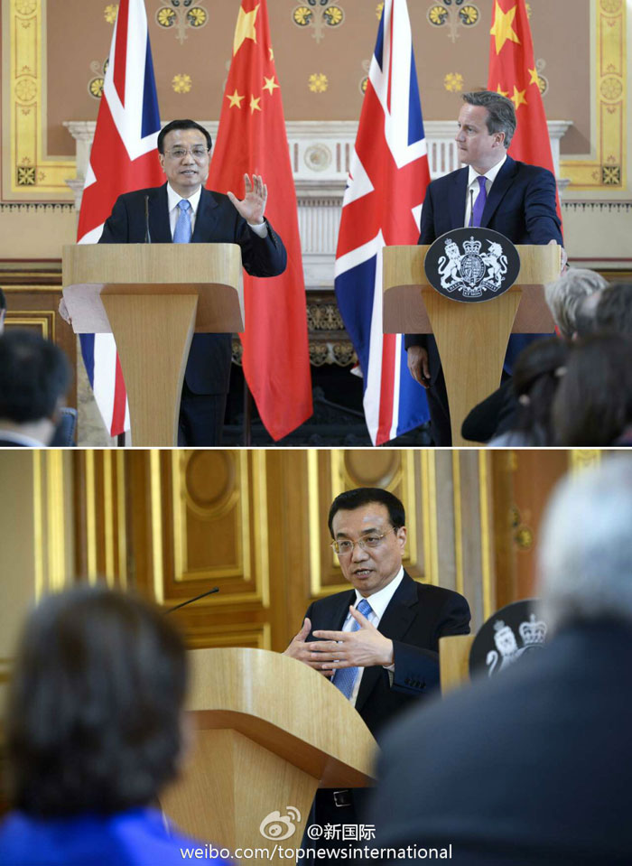 ??? 新華網(wǎng)北京6月18日電 據(jù)新華社“新國(guó)際”微博報(bào)道,17日,李克強(qiáng)與卡梅倫共見(jiàn)記者。李克強(qiáng)說(shuō),中英共同設(shè)立總額2億英鎊的科學(xué)基金,以加強(qiáng)聯(lián)合科學(xué)創(chuàng)新合作,第一個(gè)合作項(xiàng)目就是太空項(xiàng)目,這顯示了“我們合作的雄心”。未來(lái)5年中國(guó)將向英派遣1萬(wàn)名公費(fèi)留學(xué)生,也歡迎英國(guó)向中國(guó)派遣更多留學(xué)生。