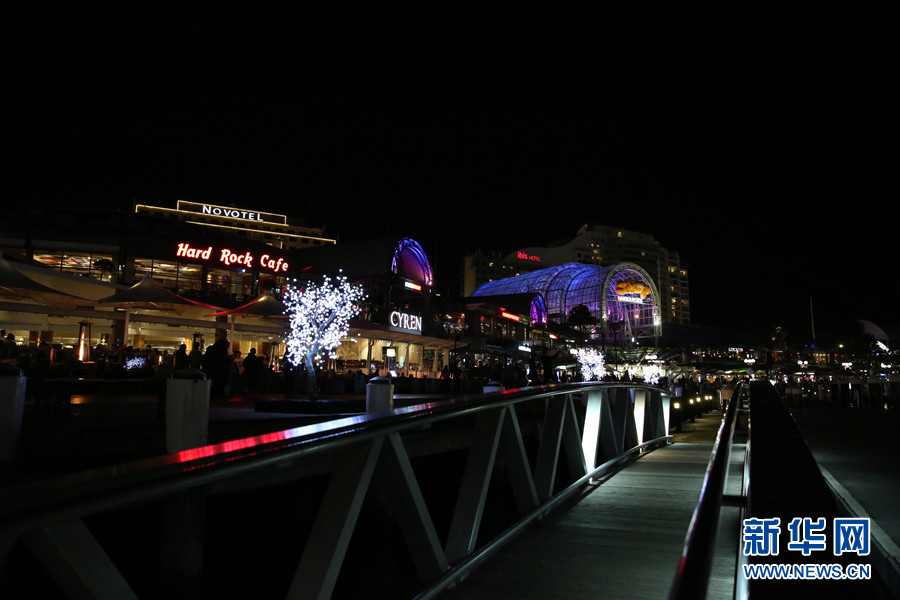 ????6月13日起,為期1個月的大型冬季冰雪活動在悉尼市中心的情人港(Darling Harbour)為悉尼市民冬季的生活增添了些許名副其實的冬季氣氛。圖為情人港岸邊沿路的樹燈。。新華社記者 李冰 攝