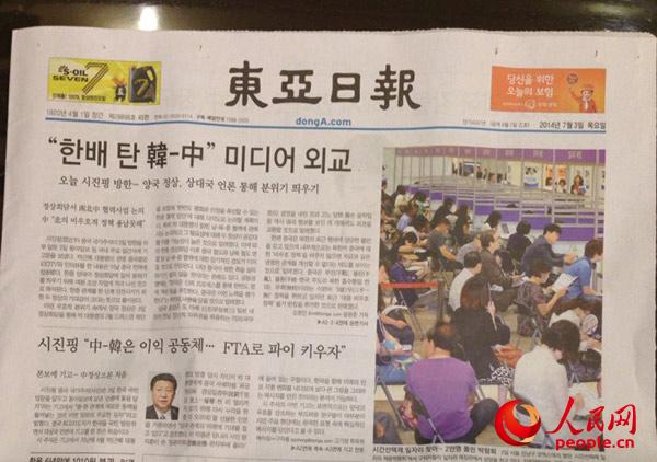??? 韓國《東亞日報》在頭版顯著位置刊發(fā)習近平主席署名文章《加快自貿(mào)區(qū)談判進程 做大利益蛋糕》金慧廷 攝