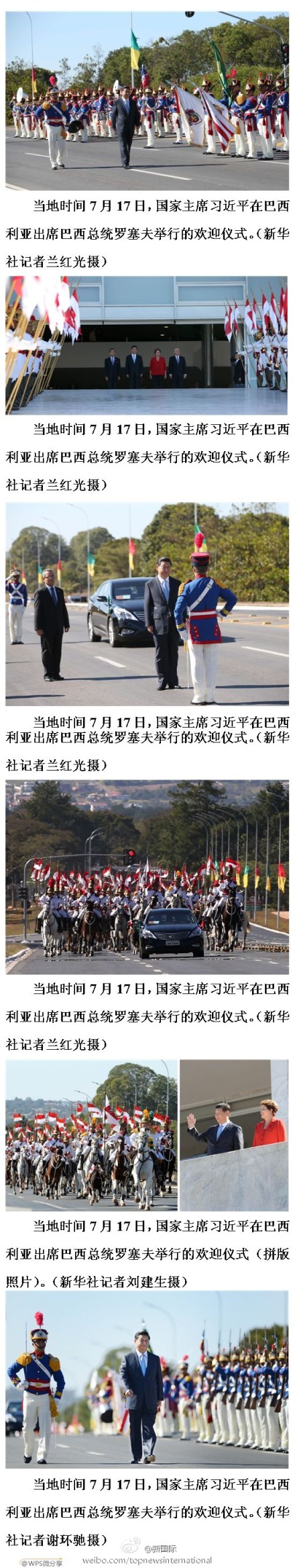 ????新華網(wǎng)北京7月18日電 據(jù)新華社“新國際”微博報道,17日,巴西總統(tǒng)羅塞夫為習(xí)近平舉行隆重歡迎儀式。在總統(tǒng)府入口處,習(xí)近平與羅塞夫親切握手、問候。軍樂團(tuán)奏中巴國歌,升中國國旗,鳴禮炮21響。隨后,兩位元首一同登上觀禮臺,觀看儀仗隊分列式。騎兵馬隊簇?fù)碇娖?,奔騰跳躍,奮蹄疾馳。?