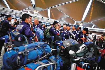 當(dāng)?shù)貢r間7月18日,馬來西亞國際機(jī)場,馬來西亞派特殊救災(zāi)和救援小組成員前往MH17墜機(jī)事故現(xiàn)場。圖/CFP