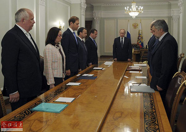 7月17日夜,在俄羅斯莫斯科州新奧加廖沃官邸,俄羅斯總統(tǒng)普京(后)和一些高級(jí)別官員在經(jīng)濟(jì)問題會(huì)議前為墜毀馬航MH17航班的遇難者默哀。普京當(dāng)晚說,馬航客機(jī)失事悲劇發(fā)生在烏克蘭領(lǐng)空,烏克蘭無疑對(duì)此承擔(dān)責(zé)任。